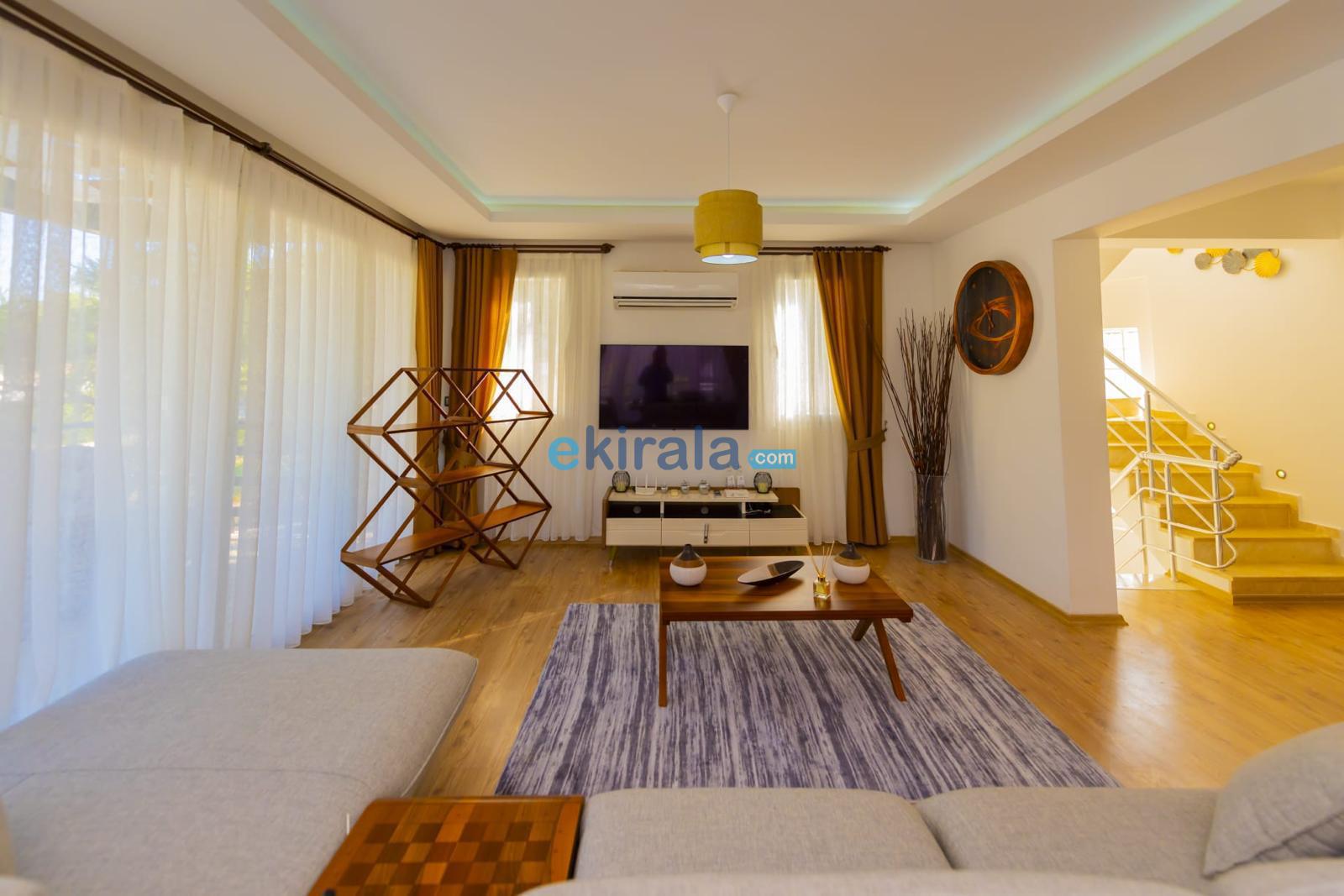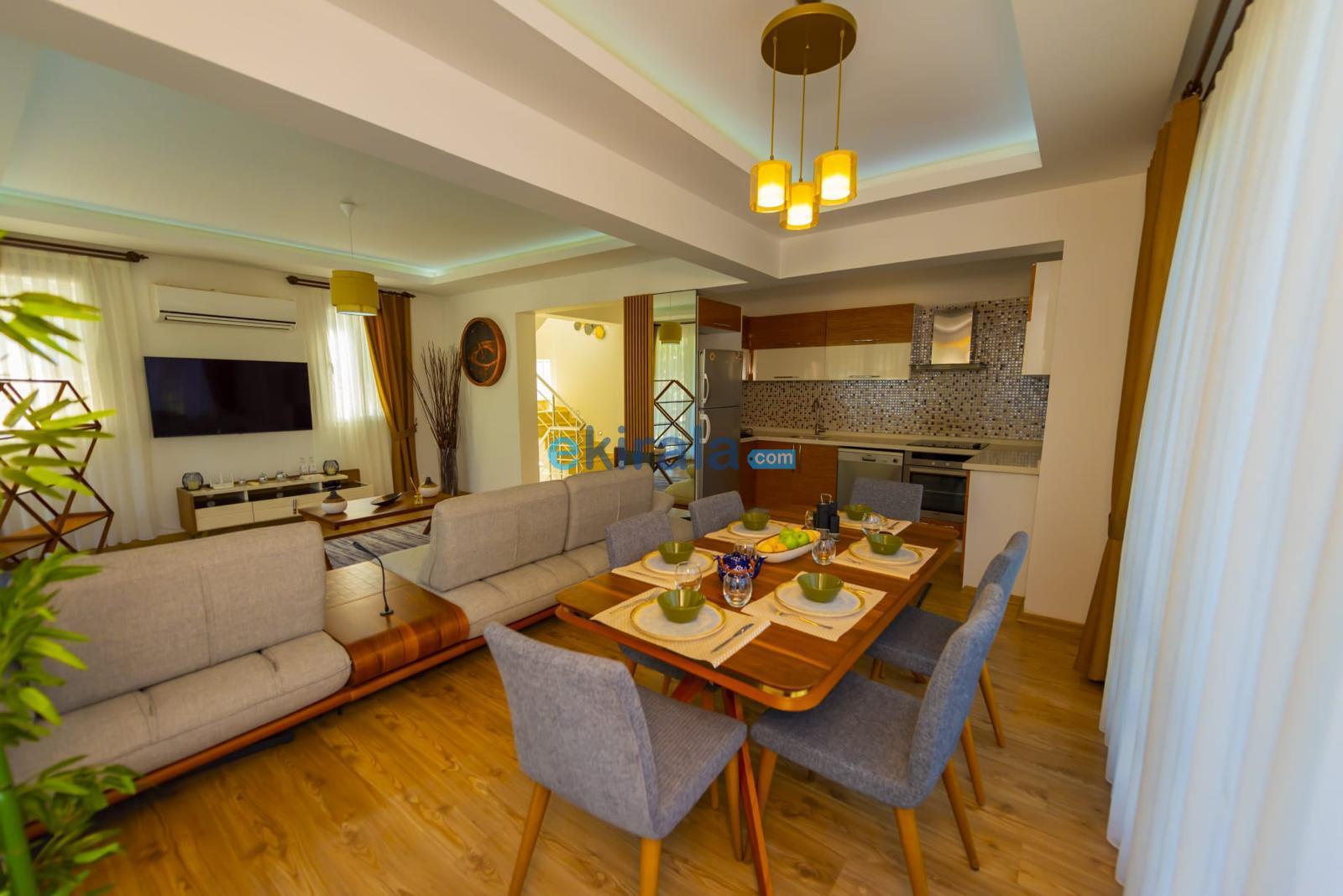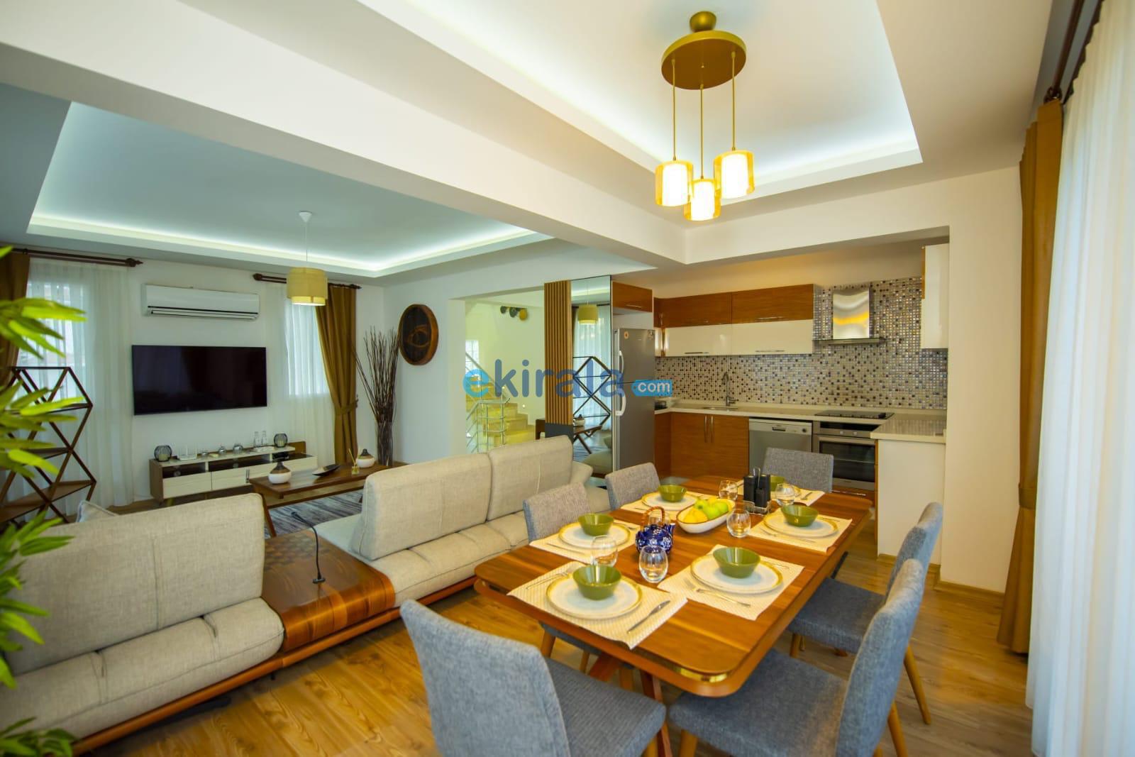 Modern ve ferah salon alanında oturma grubu, klima, LCD TV, uydu yayını, kablosuz internet ile yemek masası ve sandalyeler bulunmaktadır.