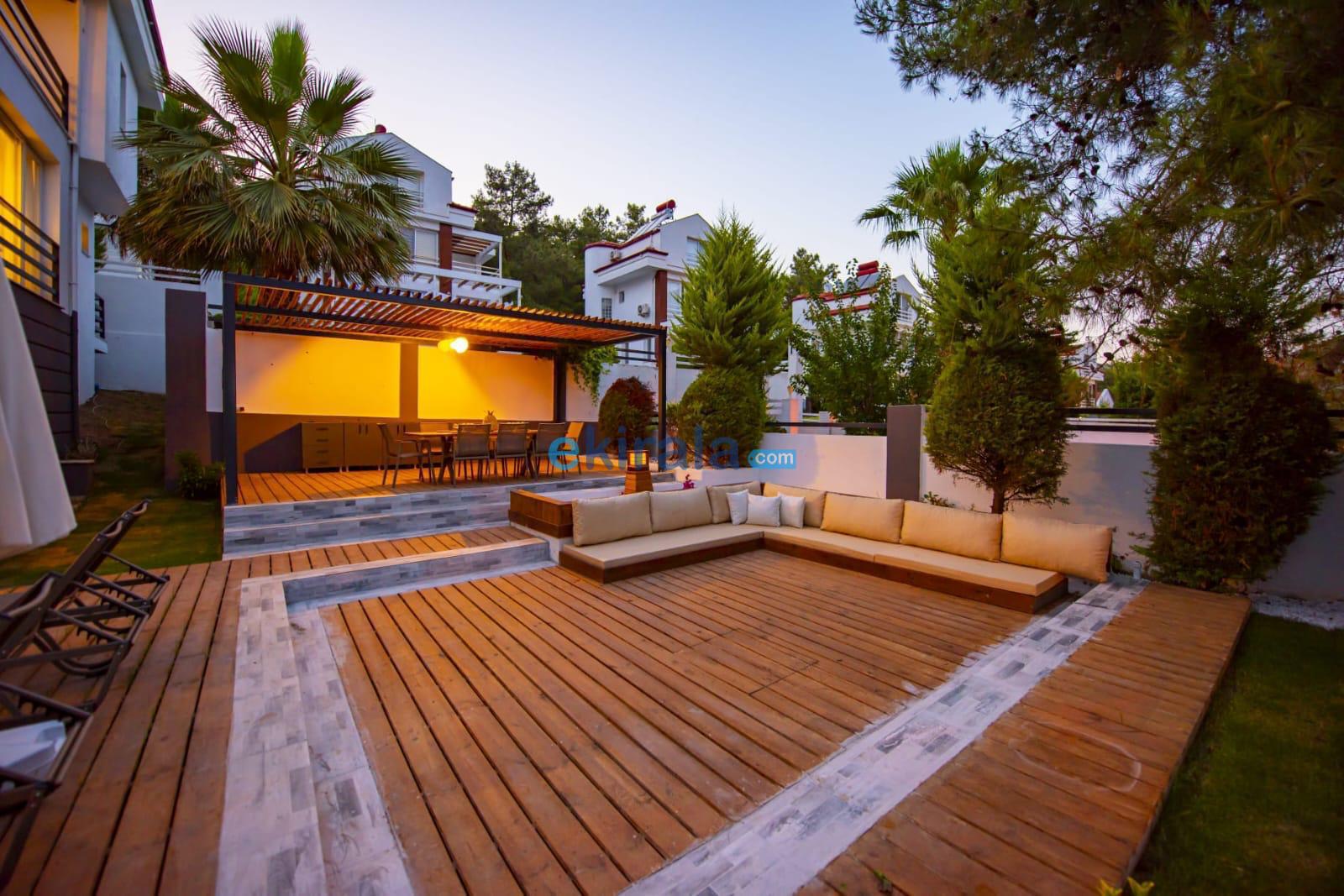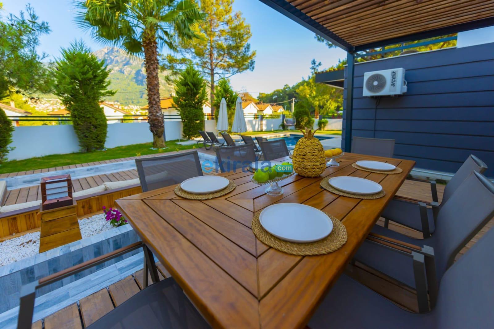 Villanın dış alanında özel yüzme havuzu, şezlonglar, güneş şemsiyesi, bahçe yemek masası, salıncak ve barbekü alanı bulunmaktadır.