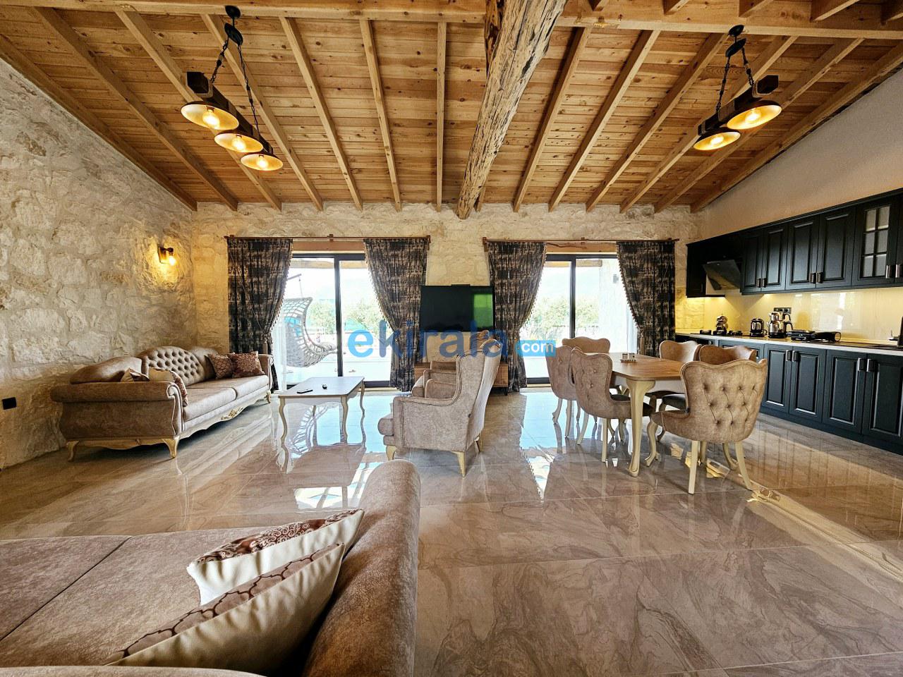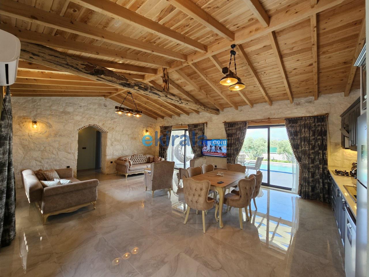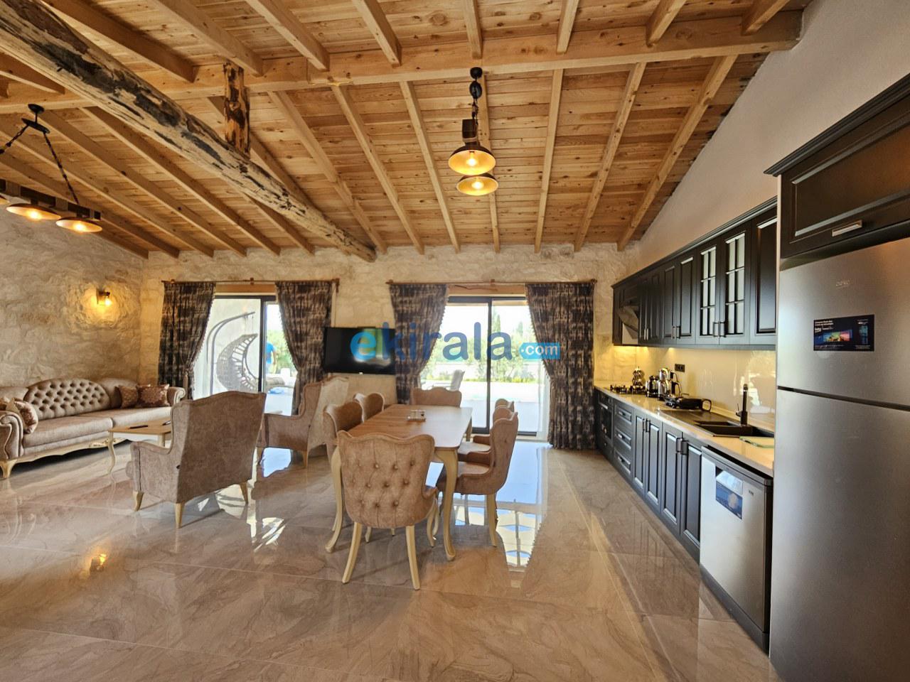 Villa Mutfak ve Salon: Amerikan mutfağında buzdolabı, çamaşır makinesi, bulaşık makinesi, ankastre 4'lü ocak,fırın, kahve makinası, tost makinası, çaycı, tabak, tava-tencere, çatal-bıçak seti, yemek masası,sandalyeleri bulunmaktadır.